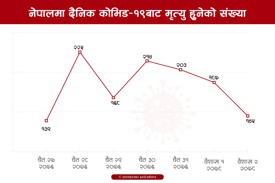 २ जेठ, काठमाडौं । मंगलबार ९ हजार ४८३ पुगेको हरेक दिन थपिने नयाँ संक्रमितको संख्या आइतबार ७ हजार ३६८ मा झरेको छ । मृतकको संख्या पनि २२५ बाट घटेर १४५ मा आइपुगेको छ । २८ वैशाख यता हरेक दिन पहिचान हुने नयाँ संक्रमित र मृतकको संख्या क्रमशः घटेको देखिएको छ ।