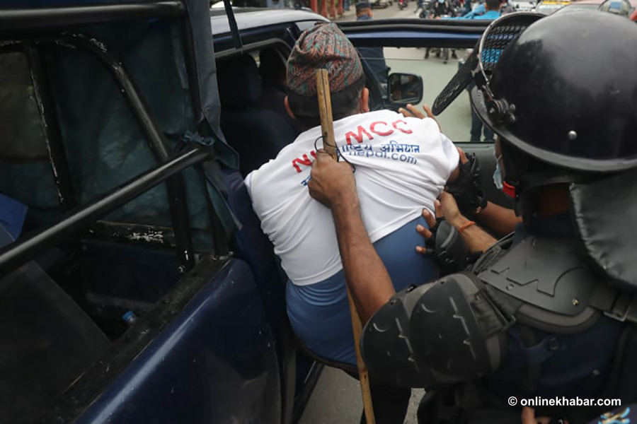 ‘नो एमसीसी’ लेखेका टि-सर्ट लगाएका एक व्यक्ति कारबाट बाहिर निस्किएर एमसीसीविरुद्ध नारा लगाएका थिए । उनलाई प्रहरीले तत्कालै नियन्त्रणमा लिएर भ्यानमा राखेको थियो । अर्का व्यक्तिले भने कारभित्रैबाट एमसीसीको विरोध गरेका थिए । उनलाई प्रहरीले नियन्त्रणमा त लिएन तर कार त्यहाँबाट हटाएको थियो ।