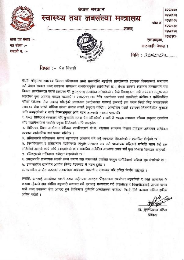 मन्त्रालयका प्रवक्ता डाक्टर कृष्णप्रसाद पौडेलले विज्ञप्ति जारी गरी अहिले पनि आन्दोलित पक्षले इमर्जेन्सी, कोभिड र पूर्वनिर्धारित परीक्षाबाहेकका सेवा अवरुद्ध गरिरहेको भन्दै त्यसो नगर्न अनुरोध गरेका हुन् ।